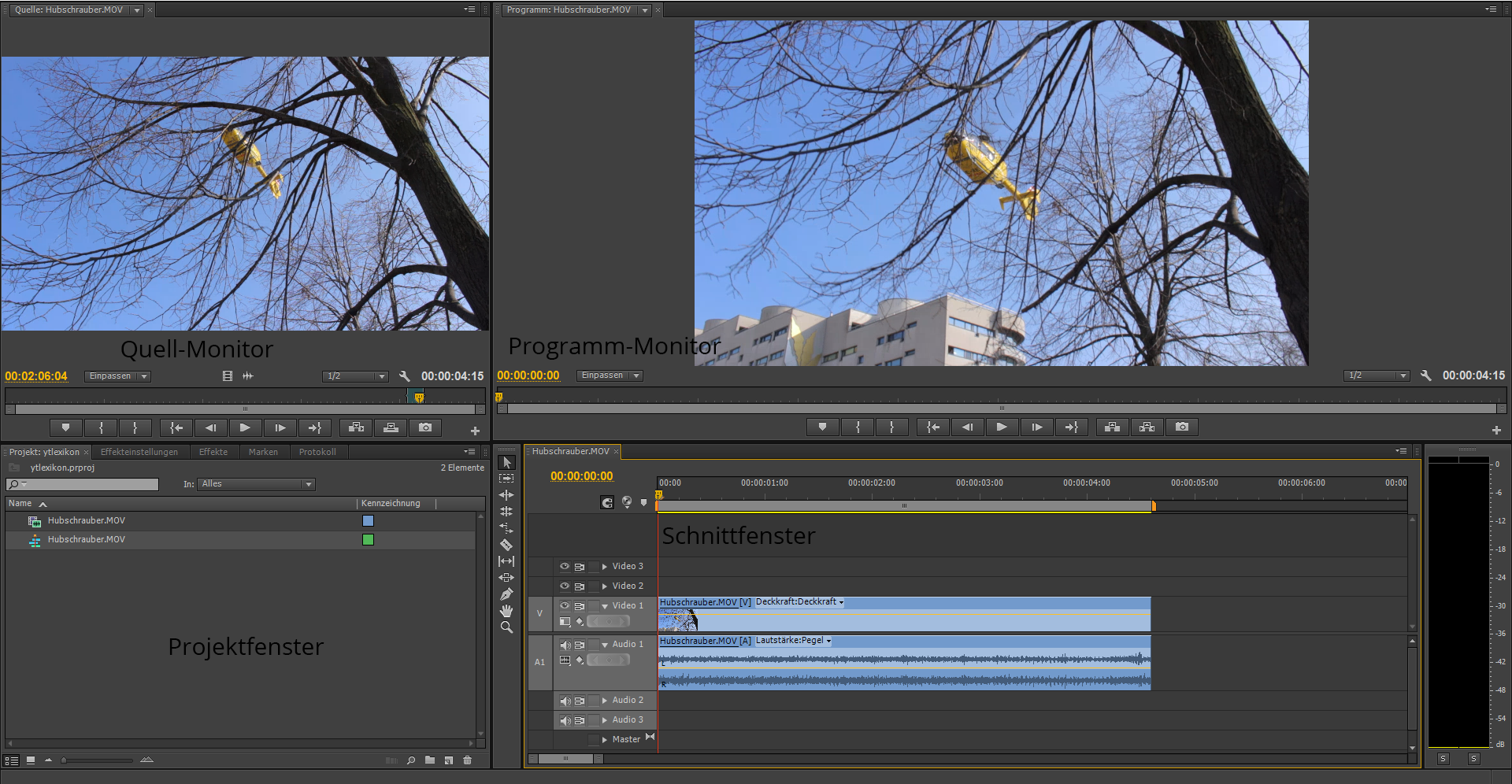 Bei Premiere Pro gibt es neben zahlreichen weiteren Fenstern unter anderem den Quell- und den Programmmonitor. Dazu auch das Projekt- und Schnittfenster. Zur besseren