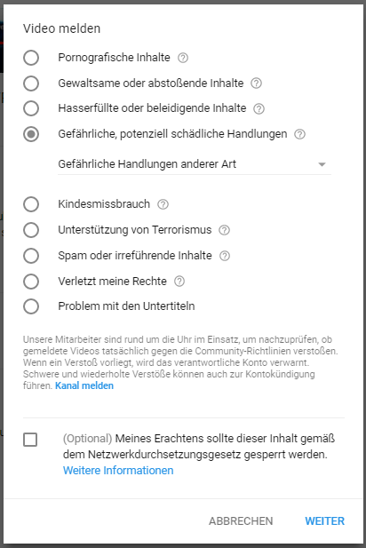 Dieses Gesetz gilt natürlich ebenfalls für YouTube. Beginn 2018 fügte YouTube dementsprechend auch eine optionale Option beim Melden von Inhalten hinzu mit dem Verweis auf das NetzDG.